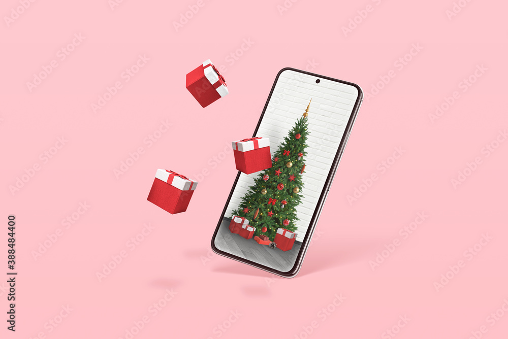 Phone with Christmas tree and gifts coming out of the display. Minimal concept with pastel pink color in background