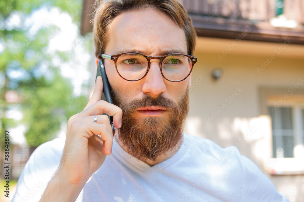 Receiving bad news via cell phone. Close-up of a young grim-faced man talking on a mobile phone while standing outdoor.