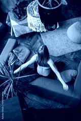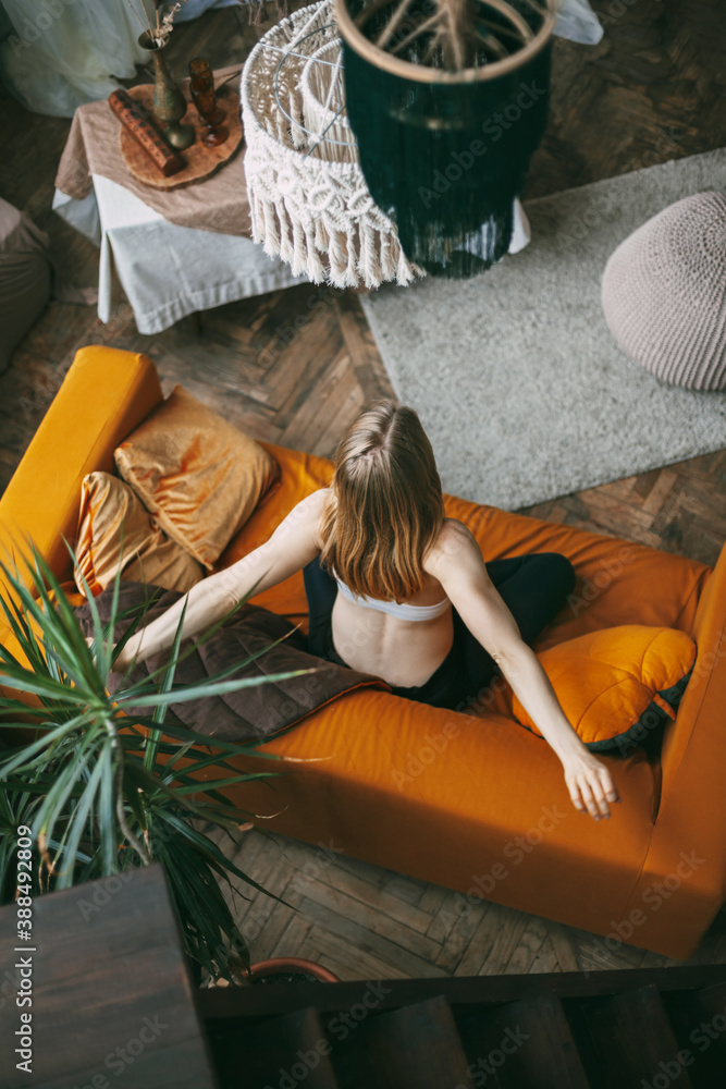 An overhead view of a woman sitting on a sofa in her home in a lotus position and practicing yoga asana.