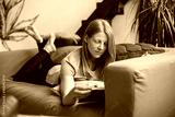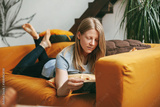 A beautiful girl is relaxing on the sofa in the living room, reading her favorite novel. Cute, thoughtful girl is lying on the couch and reading a book.