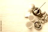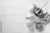 Homemade turmeric lemon ginger shots in small glasses on white wooden background. Immunity boosting natural drink. Turmeric beverage remedy for healthy strong immune system. Top view, space for text.