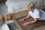 Senior sporty fit yogini woman practices yoga asana bhujangasana or cobra pose