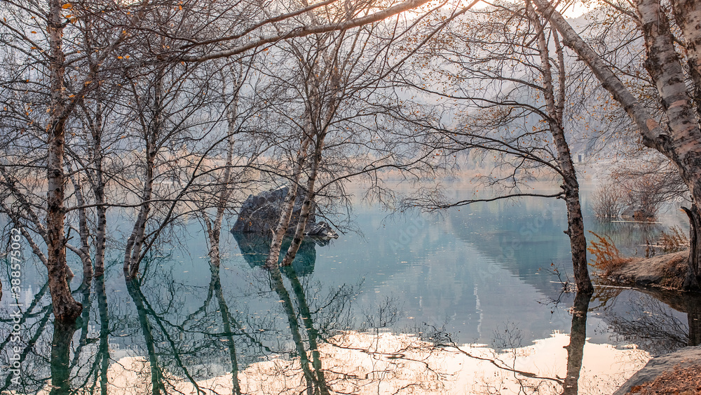 Landscape-birch trees in a beautiful mountain lake in autumn colors. The concept of local travel. Almaty, Kazakhstan. electoral focus