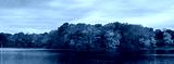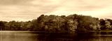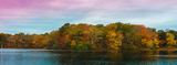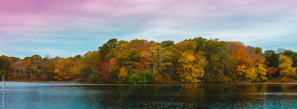 Panoramic autumn lake landscape with colorful foliages and reflections on the water surface