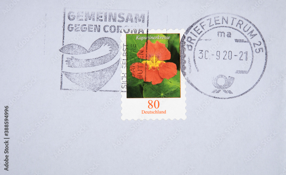 Briefmarke stamp slogan gestempelt used frankiert cancel blume flower orange corona covid-19 gesundheit gemeinsam 80 kapuzinerkresse plant pflanze