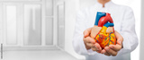 Treatment concept for heart disease, heart attacks, and myocardial infarction. Experienced cardiologist holding an anatomical model of the heart in his hands over the corridor of a modern clinic