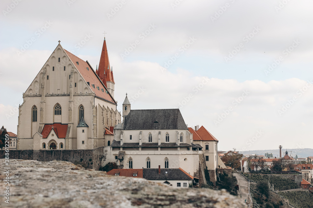 Panorama of Znojmo town, South Moravia, Czech Republic, Europe. View of old red roofs and houses. St. Nicholas church with tower and St. Wenceslas chapel over sky. European travel concept.