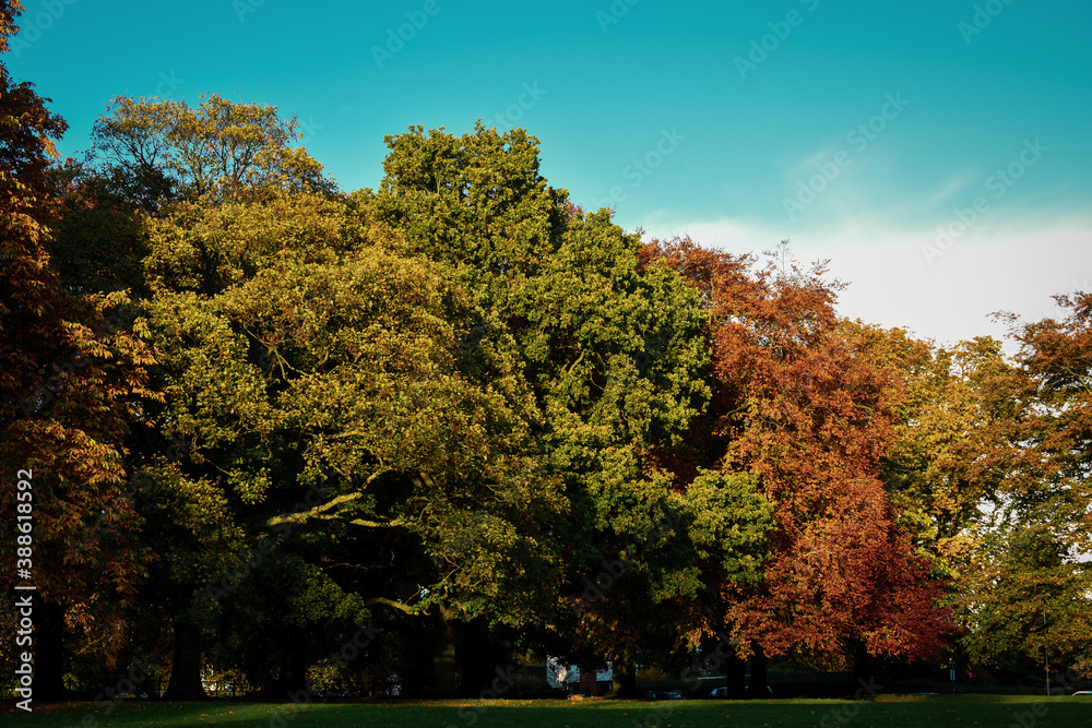 Autumn colours in the trees as the sunlight shines during golden hour at sunset in a park