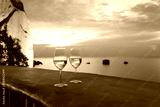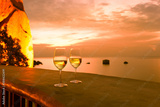 Wine and a beautiful sunset ocean view. Romantic vacation setting.