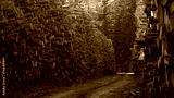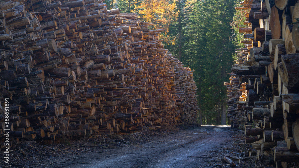 CLOSE UP: Neatly stacked tree trunks are illuminated by golden autumn sunshine.