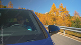 CLOSE UP: Young male tourist drives his blue car along a scenic mountain road