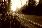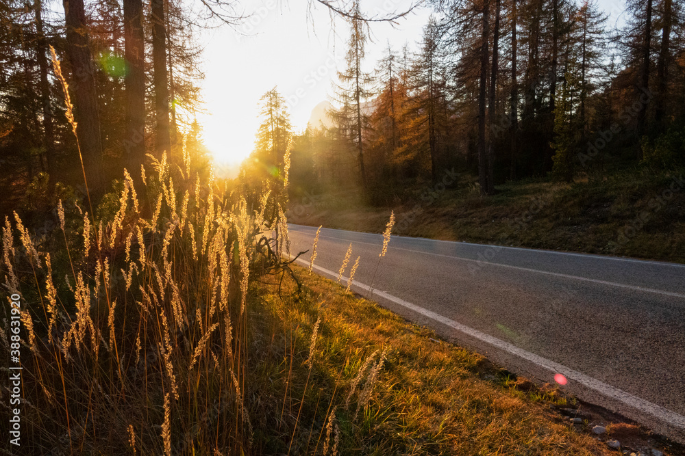 CLOSE UP Golden autumn evening sunbeams shine on an empty mountain road in Italy