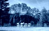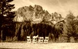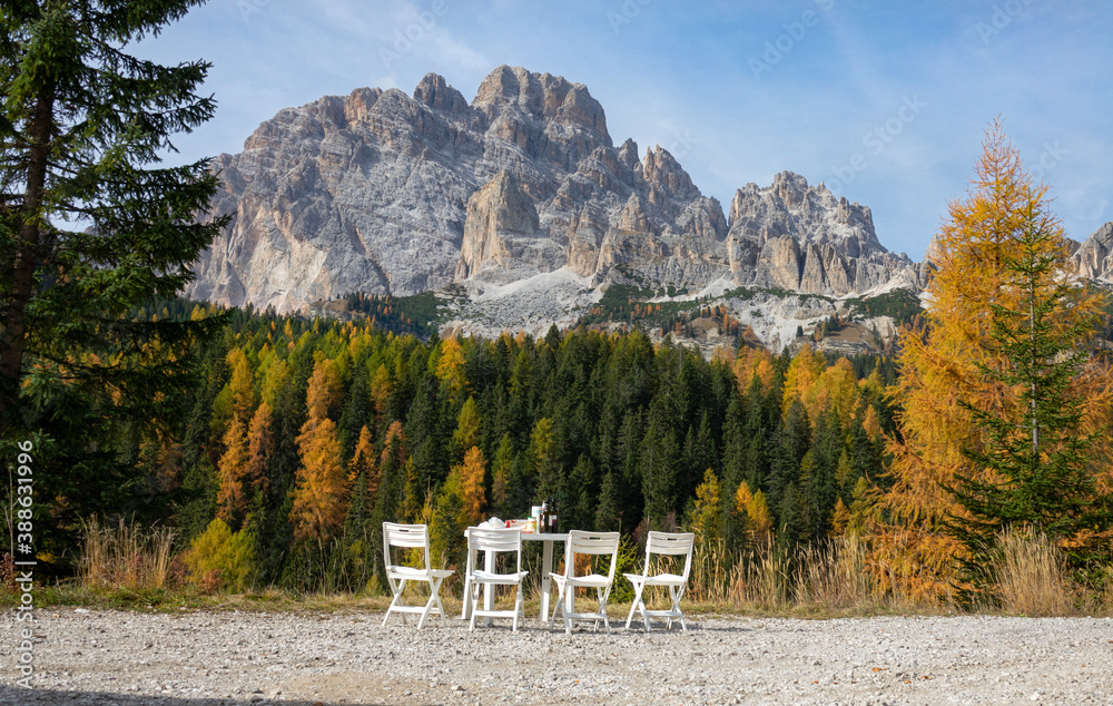 Picnic table stands full underneath a scenic rocky ridge in the Italian Alps