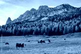 Cows graze in the empty meadow leading up to a fall colored forest in Dolomites.