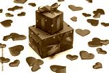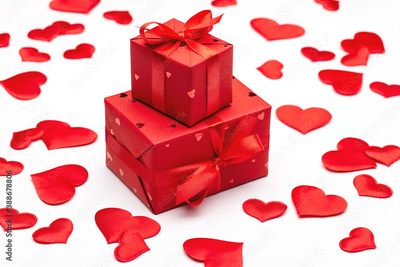 Beloved's gift for Valentine's Day. Box packed in red paper with red satin ribbon on light background.
