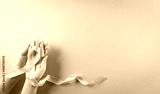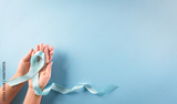 World diabetes day awareness concept. Hand holding blue ribbon, symbolic bow color raising awareness in diabetes day on pastel background, 14 November.