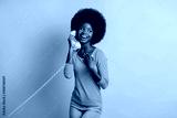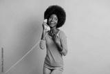 Photo portrait of black skinned woman talking on retro telephone keeping yellow handset with wire isolated on vibrant blue color background