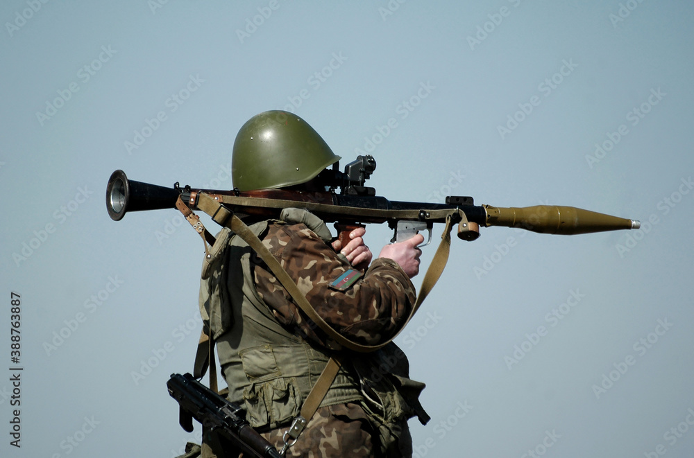 Soldier with antitank grenade launcher and flag of the Azerbaijan on military uniform. Collage.