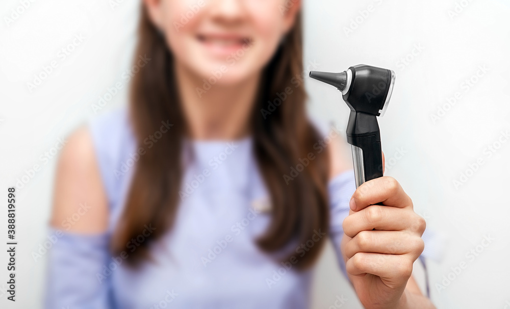 Otoscope in hand of a teenage girl, close-up. Concept ear treatment and hearing exam to a children. Soft focus