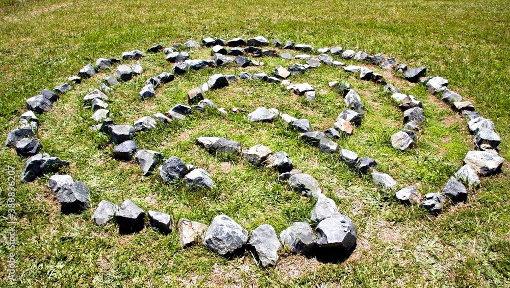 Simple rock labyrinth embedded in grassy area.