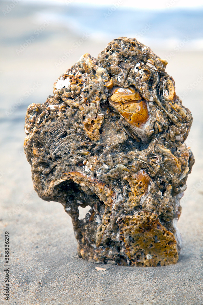 Encrusted seashell conglomerate in ocean surf.