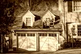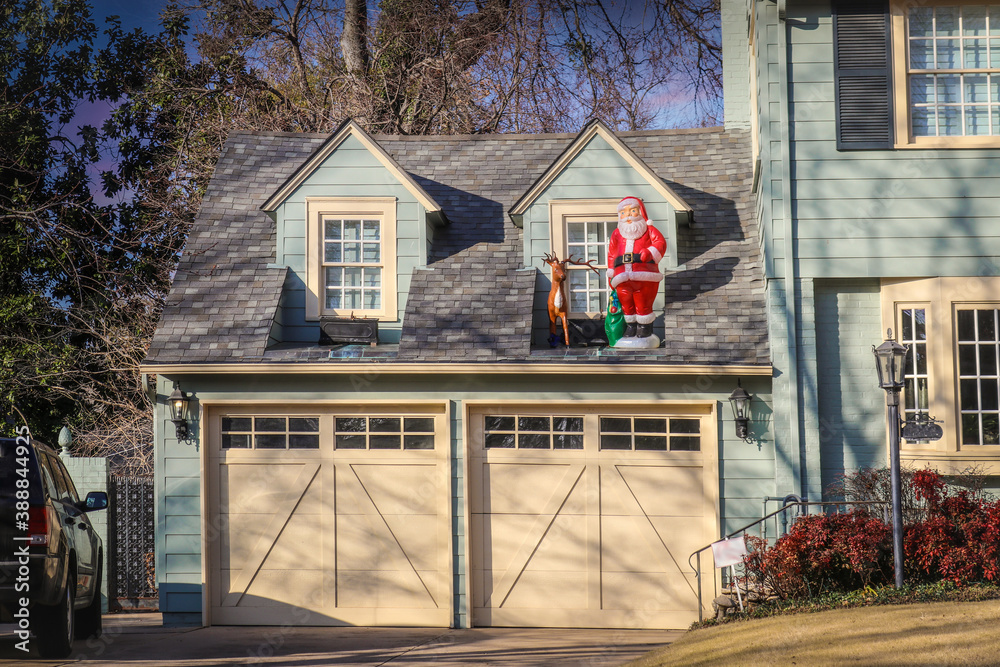 Two car garage of upscale house with plastsic santa and deer displayed by upstairs windows in evening