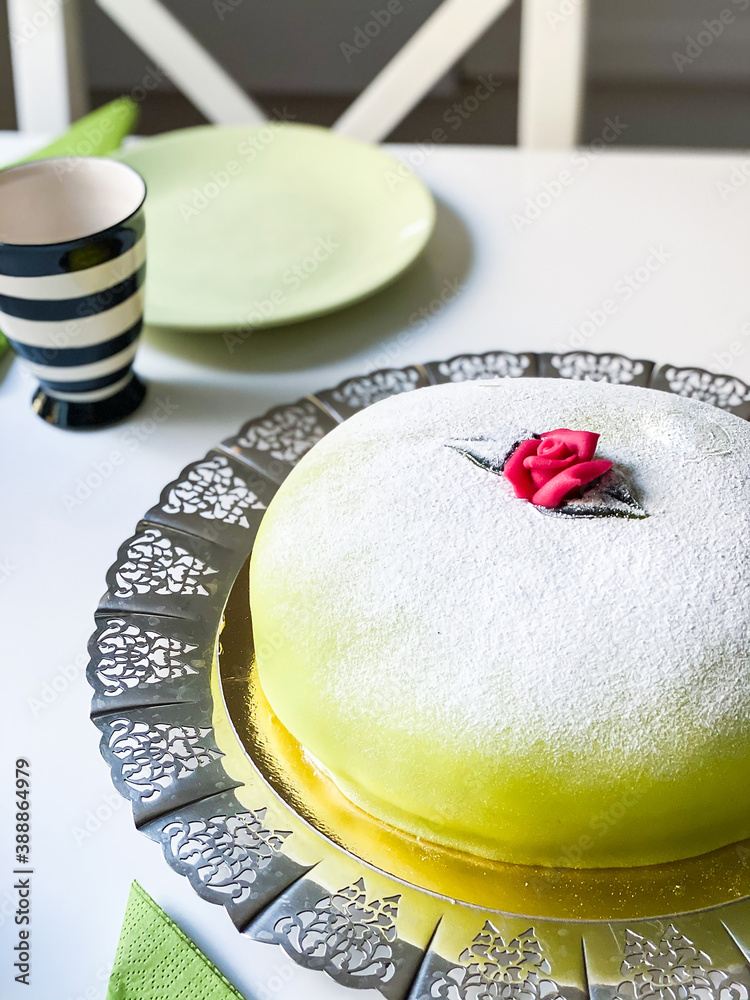 Green marzipan cake on silver cake plate and set table. Pink marzipan rose. Swedish birthday cake. Födelsedag. Prinsesstårta.