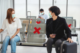 three travelers Asian wearing face masks protection covid 19 with sitting social distancing in airport terminal