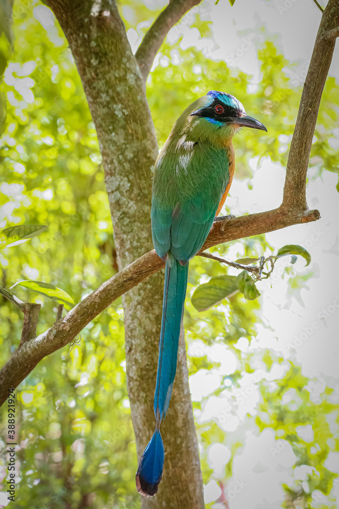 Close up of a Whooping motmot perched on a tree branch, blurred green leaves in background, Colombia