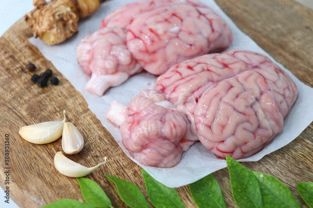 Uncooked Goat brain or Bheja.Perfect to cook bheja fry or bheja masala. Indian cooking ingredients. Copy space.