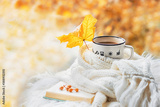 Autumn morning. A cup of coffee or hot tea on an open book and a warm sweater against a background of autumn leaves. Still life concept. Copy space.