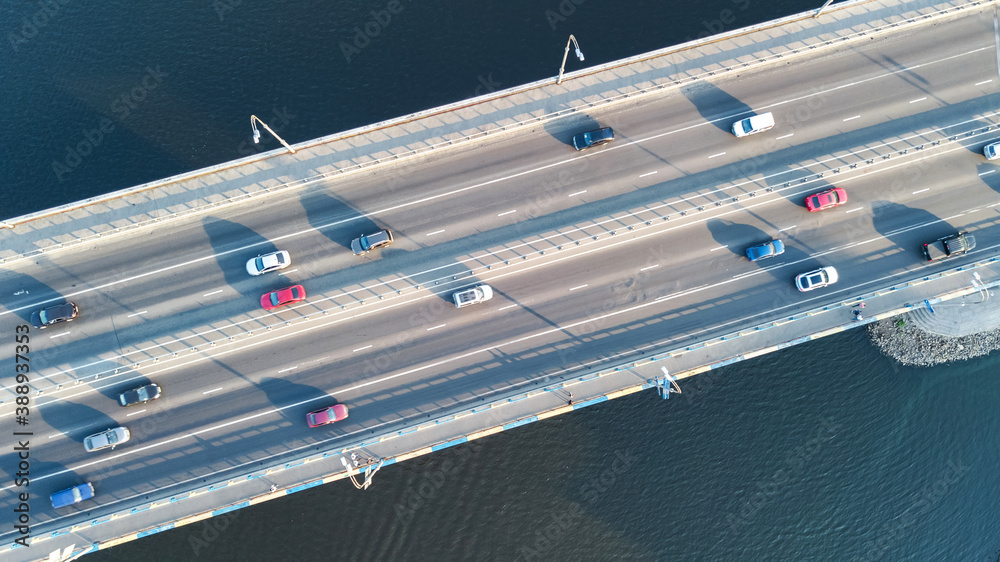 Aerial top view of bridge road automobile traffic of many cars from above, city transportation concept