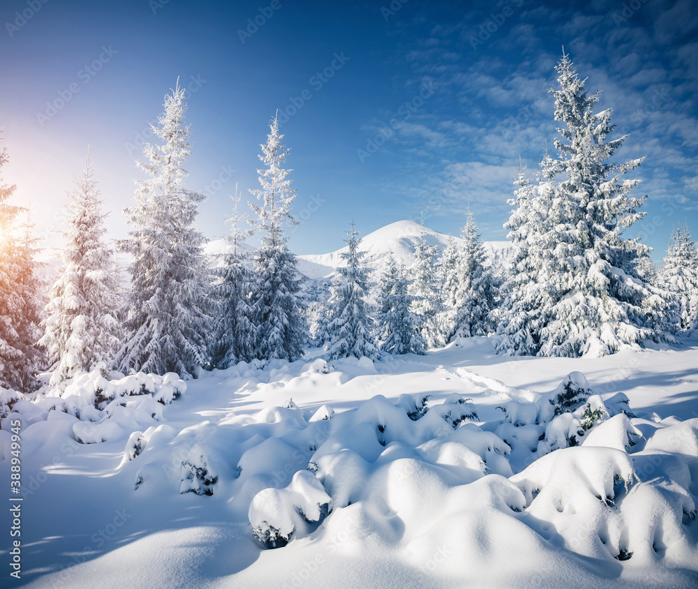 Attractive image of white spruces on a frosty day. Location place Carpathian ski resort, Ukraine.
