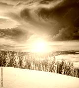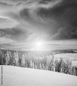 Morning frosty landscape and snowy coniferous forest. Location place Carpathian mountains, Ukraine, Europe.