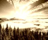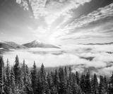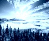 Fantastic winter landscape with spruces covered in snow. Frosty day, exotic wintry scene.