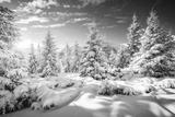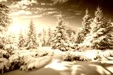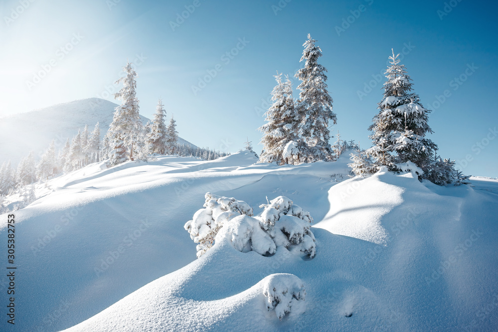 Frosty day in snowy coniferous forest. Christmas holiday concept.