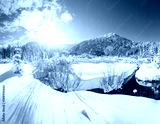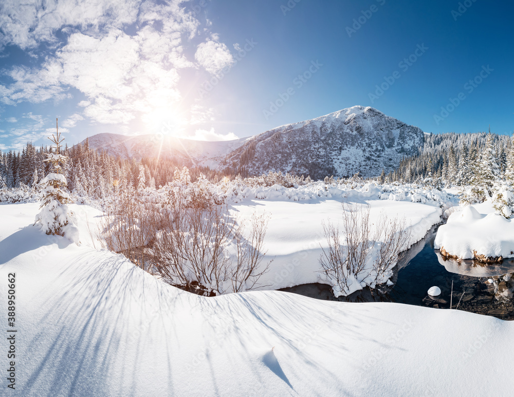 Snowy landscape on a frosty day, frozen trees in winter mountains.