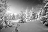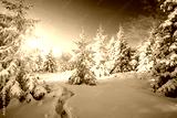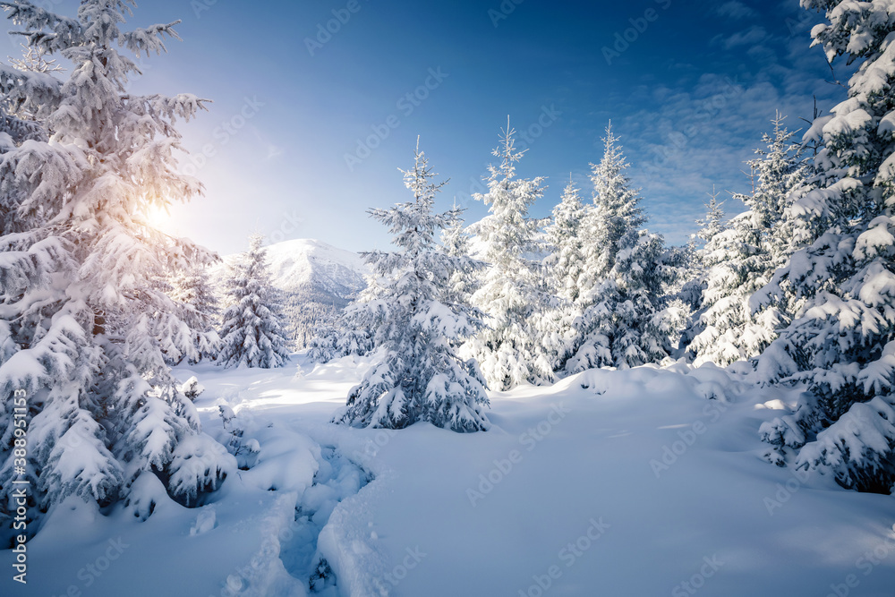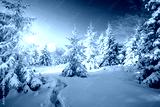 Frosty day in snowy coniferous forest. Christmas holiday concept.