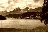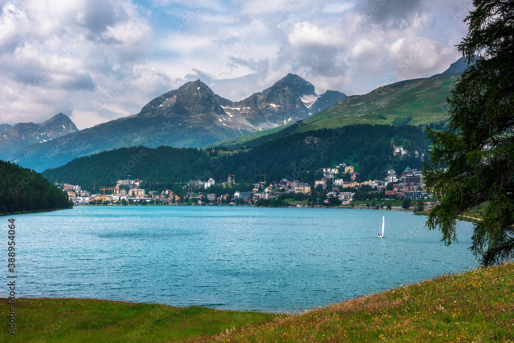 St. Moritz with lake called St. Moritzsee and Swiss Alps in Engadin, Switzerland