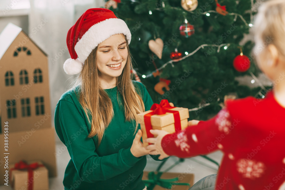 Two happy and cheerful sisters in trendy New Year's outfits give each other gifts at home under the tree. Christmas mood. Concept for New Years holiday at home.