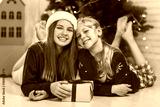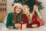 Two happy and cheerful sisters in fashionable New Year's outfits open gifts at home under the Christmas tree. Christmas mood. Concept for New Years holiday at home.