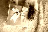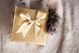 A gold-colored gift box in gray-black cat paws. The concept of gifts for pets for the new year and christmas.