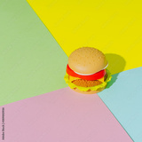 Appetizing burger with shadow on green, yellow and pink background. Creative concept. Plastic pop art isometric style. Minimalism