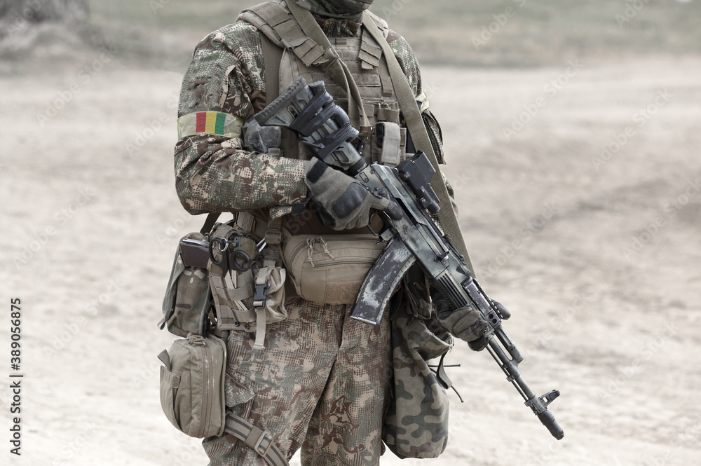 Soldier with assault rifle and flag of Republic of Guinea on military uniform. Collage.