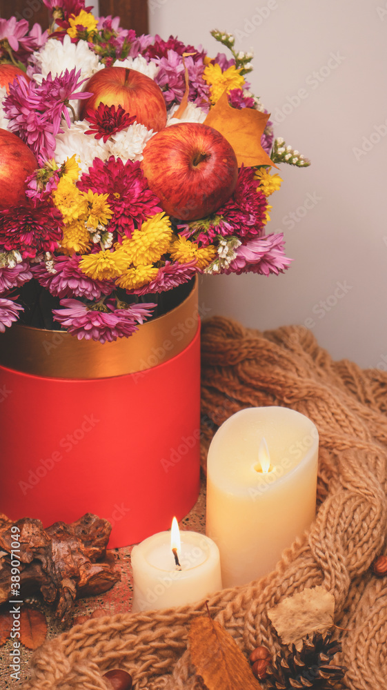Autumn bouquet of flowers and apples. Autumn bright background with apples, chrysontema, dry leaves. September October November. Seasonal autumn background with yellow and orange colors.