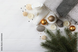 spa composition on the table and Christmas accessories. Relaxation care products. Skin care