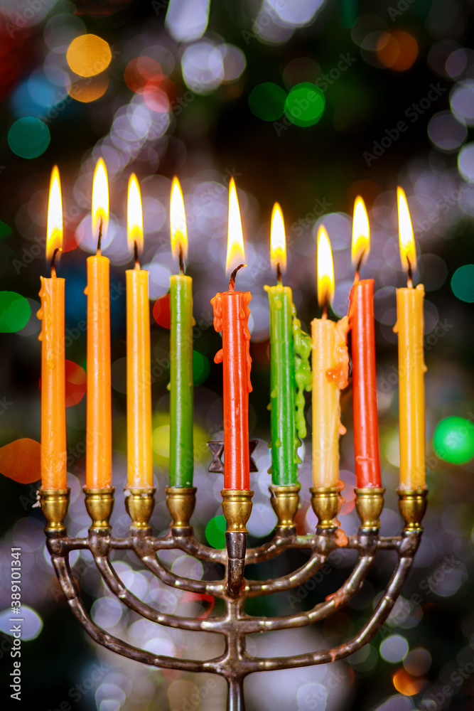 Hanukkah background with menorah and burning candles on sparkle background with defocused lights.