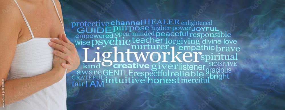 Divine Feminine Lightworker word cloud - female in white dress with hands held over heart beside a LIGHTWORKER word cloud on a blue energy field background