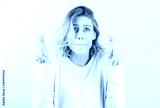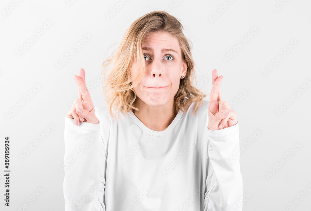 Pleased cheerful brunette woman puts all efforts in wishing good luck, crosses fingers, has faith for better, isolated over white background