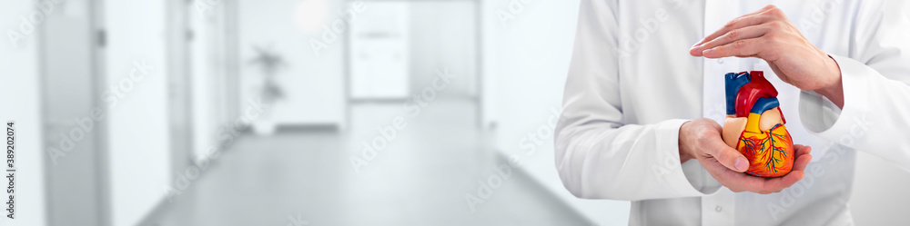 Cardiologist wear medical coat holding a model heart in his hands, over corridor hospital. Web banner, medical support for human cardiac health